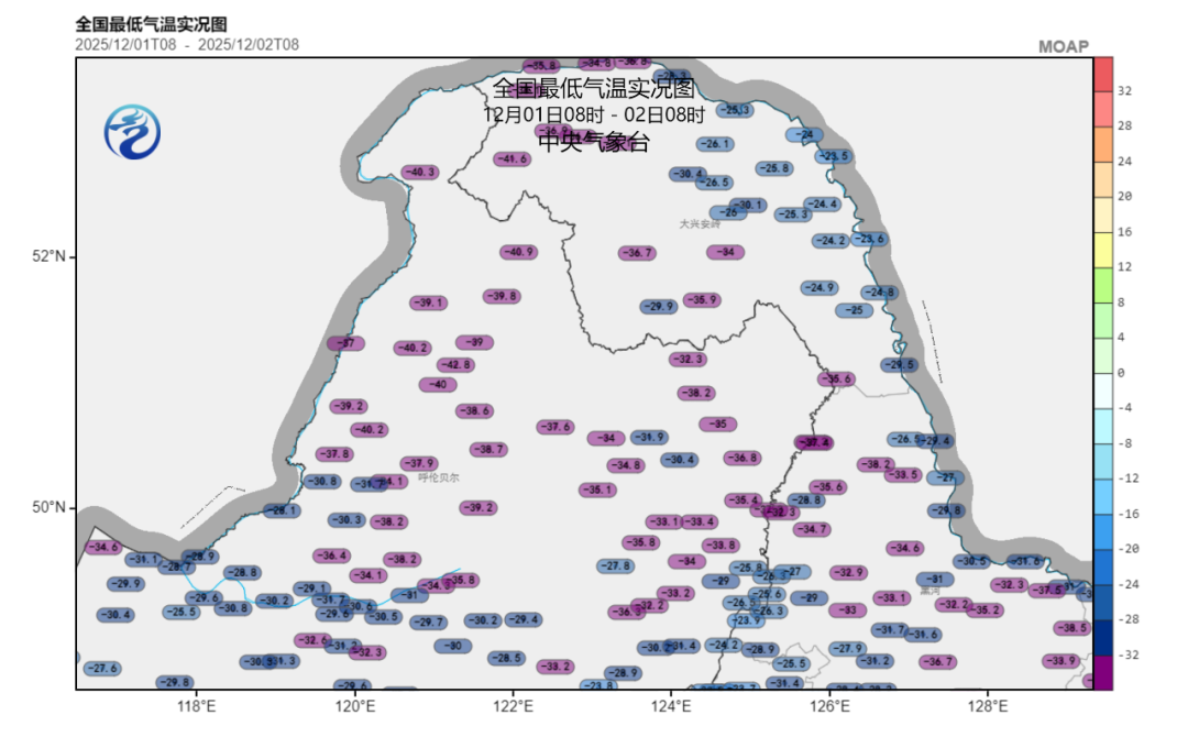 今天早晨,内蒙古东北部、黑龙江北部等地出现零下30℃以下的极寒天气。